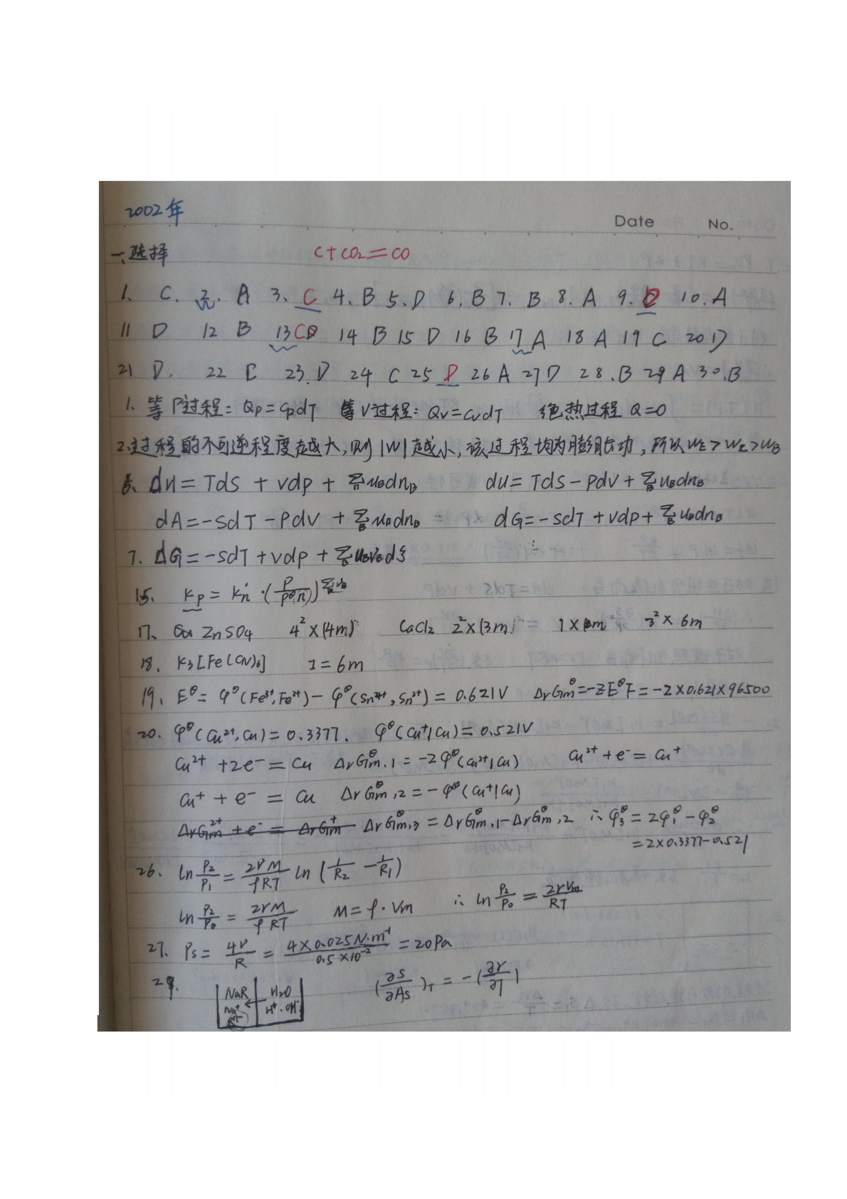 陕西师范大学730物理化学(含结构化学)2002年真题答案手写版