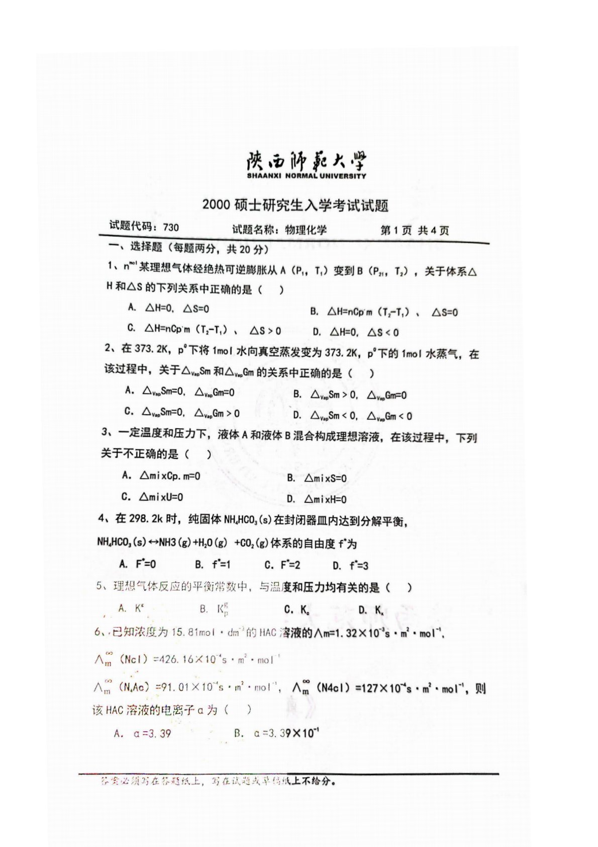 陕西师范大学730物理化学(含结构化学)2000年真题