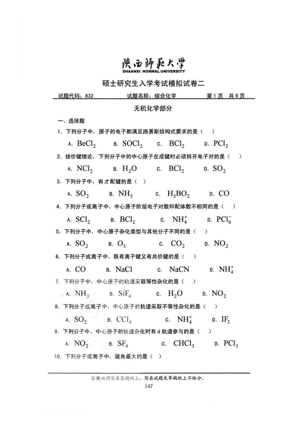 陕西师范大学832综合化学模拟试卷2