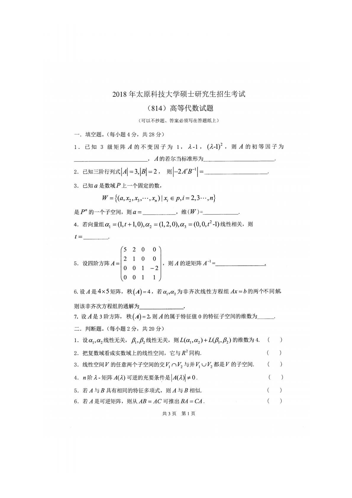 太原科技大学814高等代数2018年真题