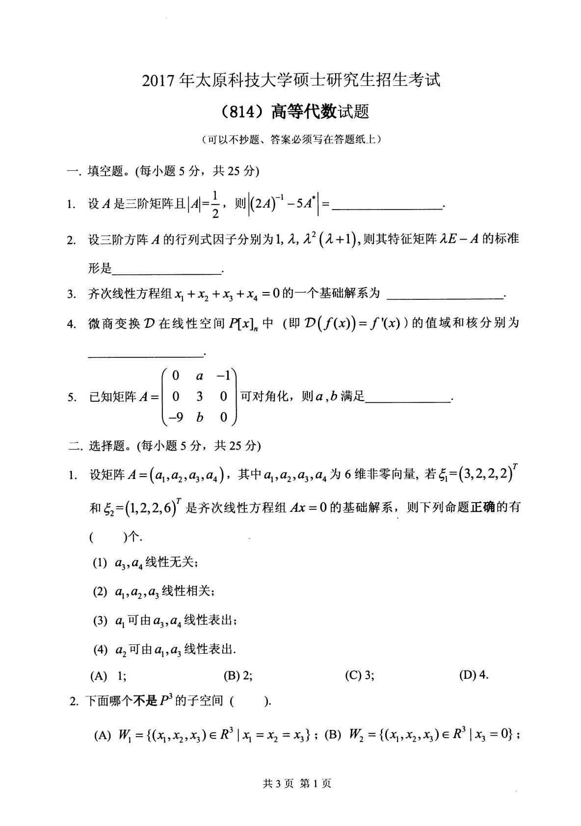 太原科技大学814高等代数2017年真题
