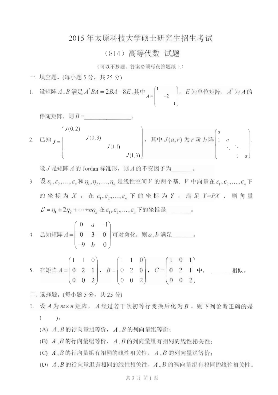 太原科技大学814高等代数2015年真题