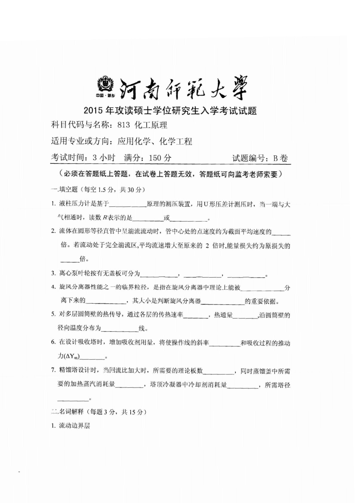 河南师范大学813化工原理2015年真题