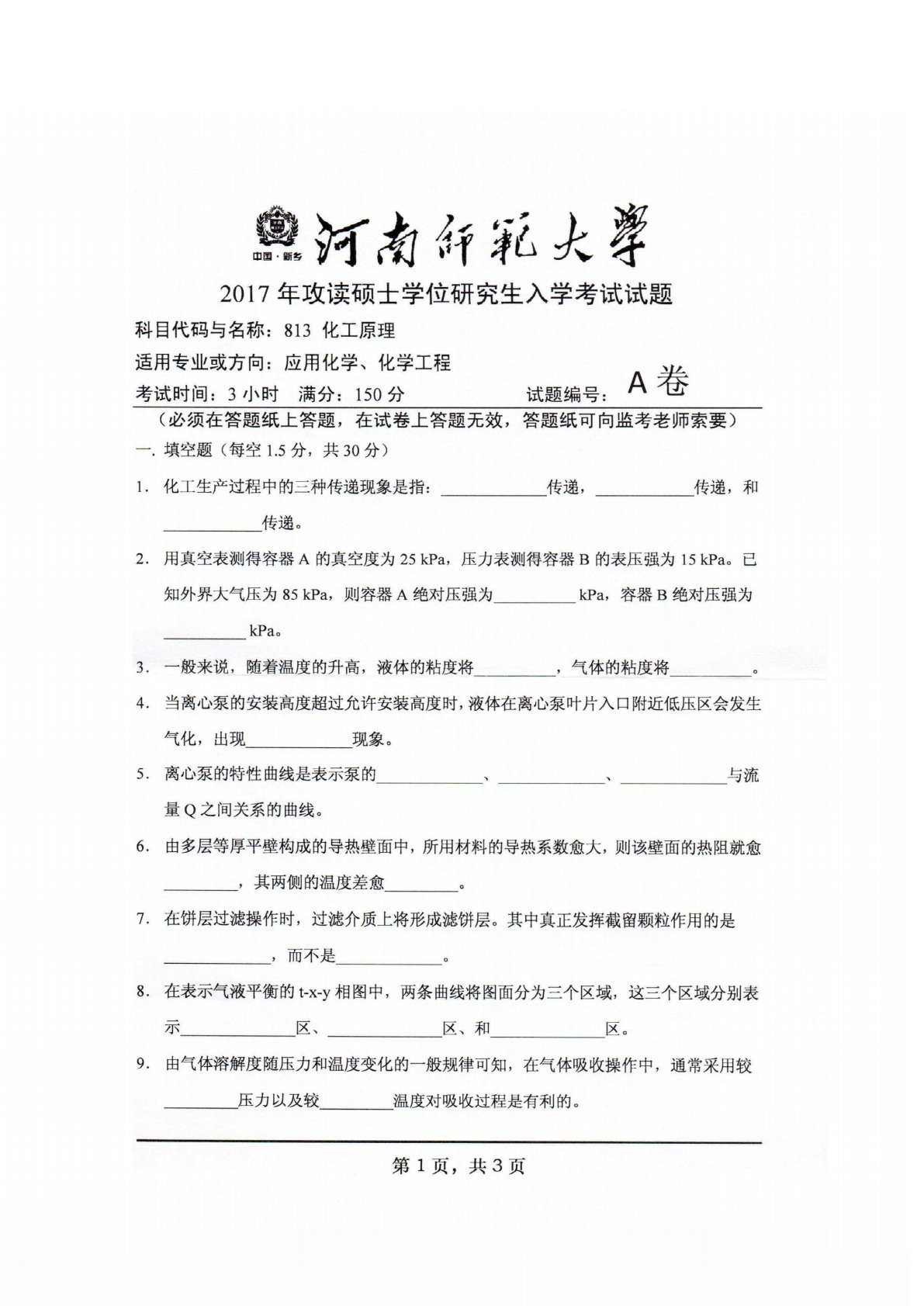 河南师范大学813化工原理2017年真题