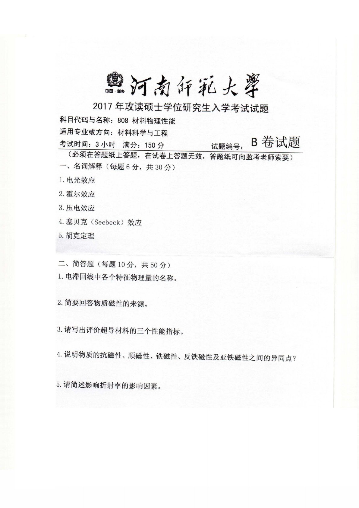 河南师范大学2502材料物理性能2017年真题