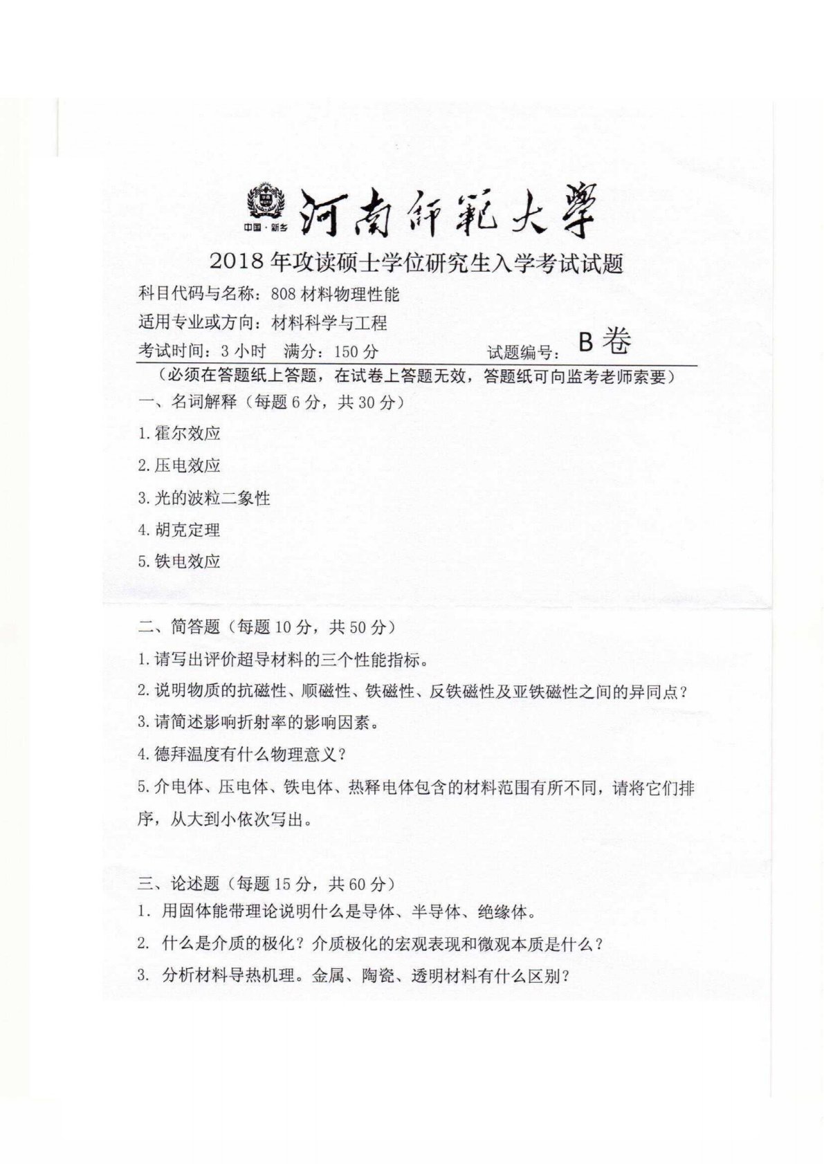 河南师范大学2502材料物理性能2018年真题