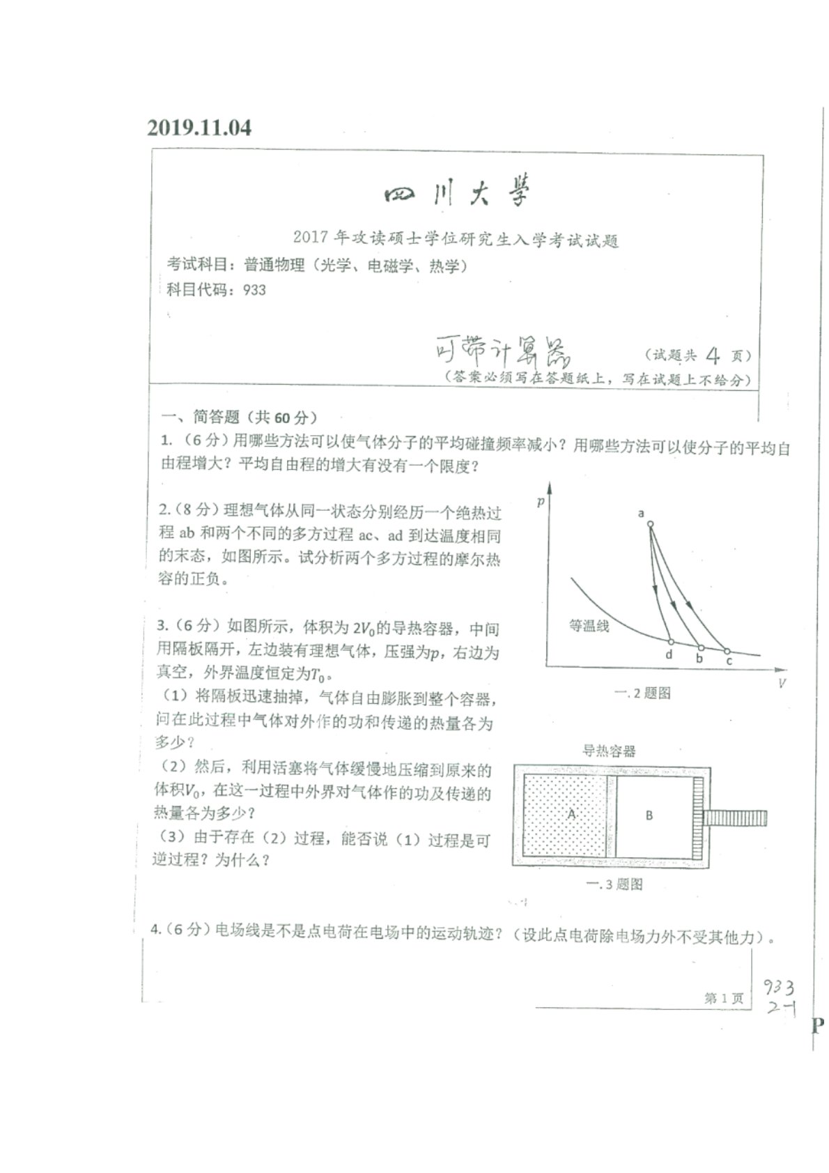 四川大学822普通物理(光学、电磁学)2017年真题1.