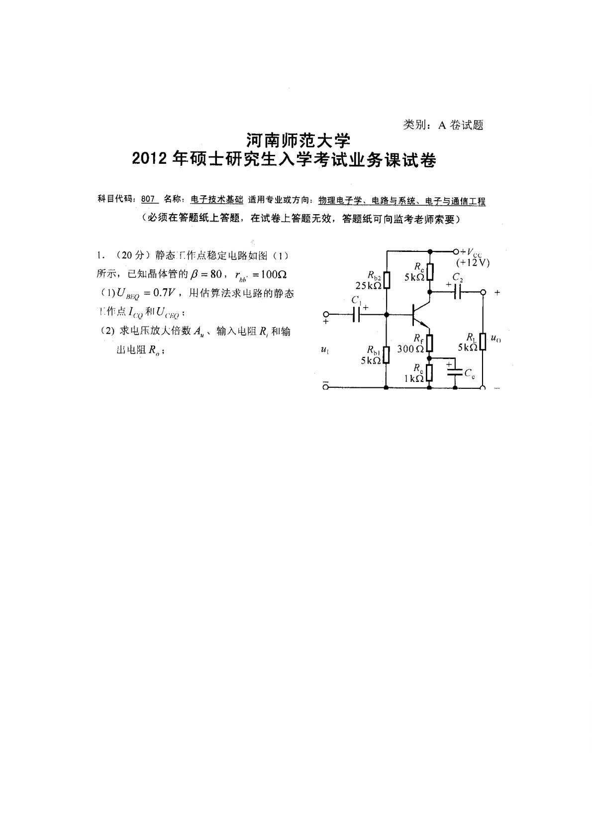 河南师范大学2201电子技术基础2012年真题