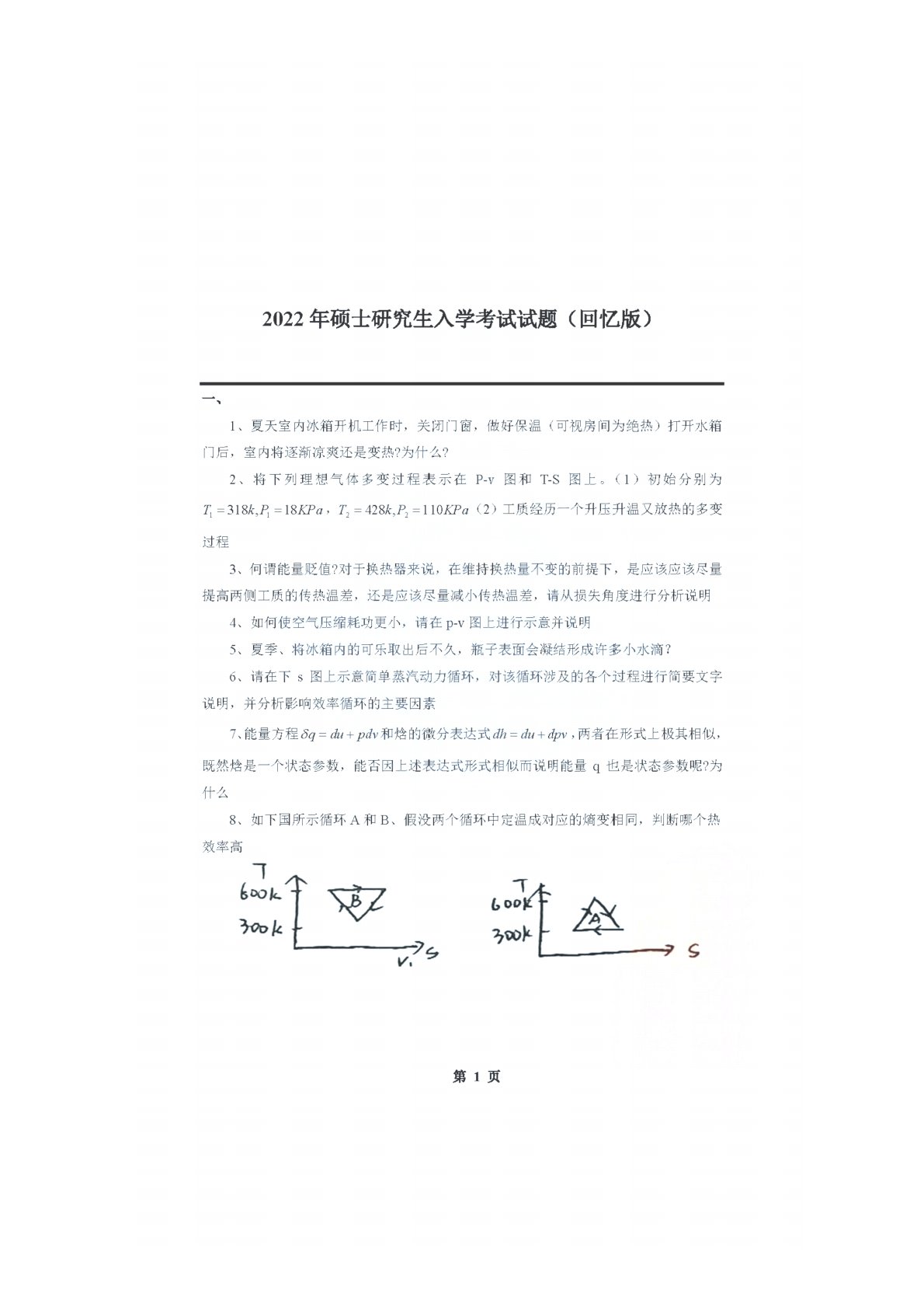 河北工业大学831工程热力学2022年真题及答案回忆版