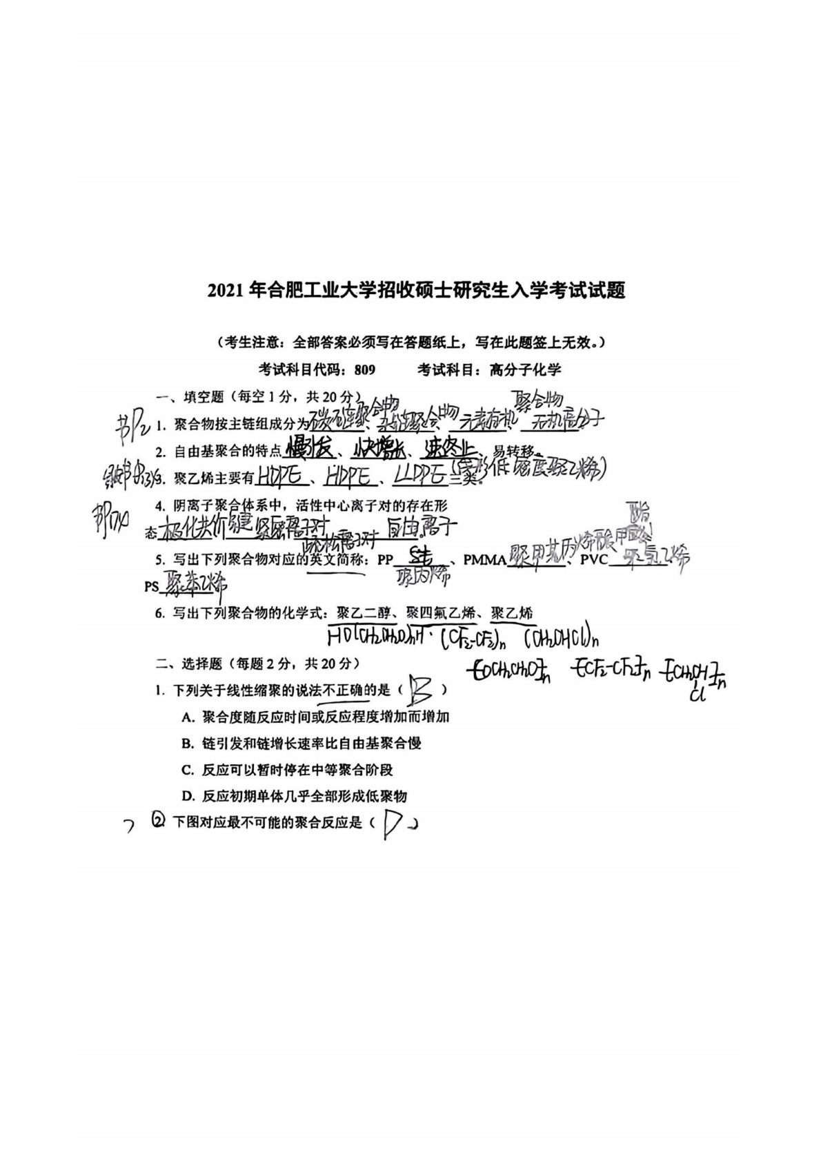 合肥工业大学809高分子化学2021年真题