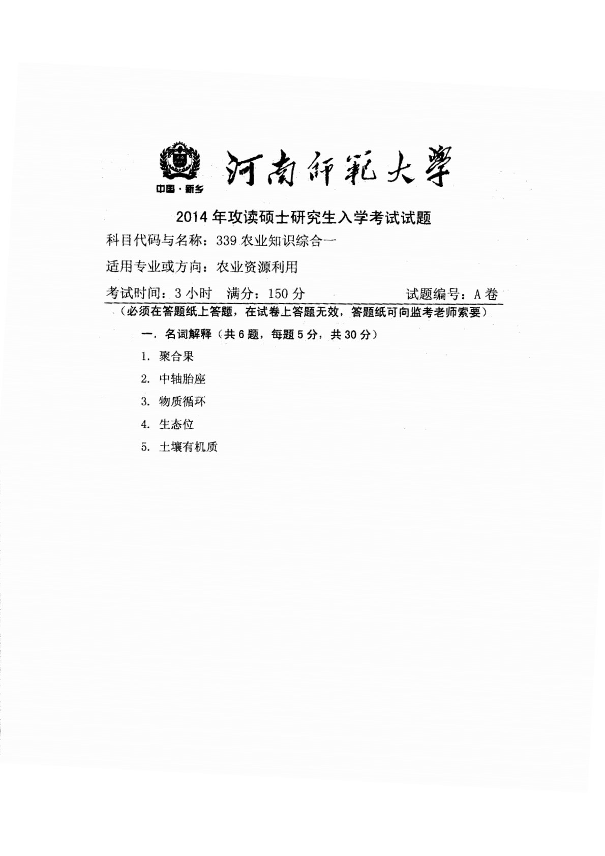河南师范大学339农业知识综合一2014年真题