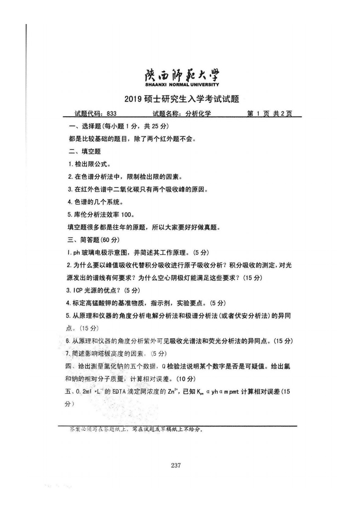 陕西师范大学832综合化学2019年真题(分析化学)