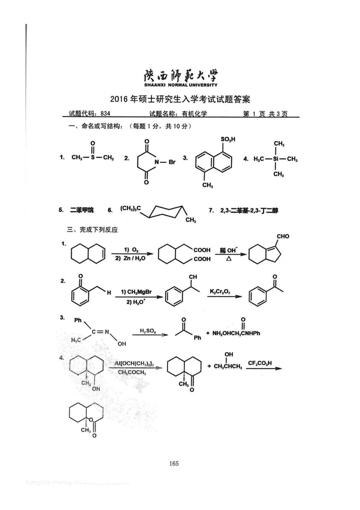 陕西师范大学832综合化学2016年真题答案(有机化学)