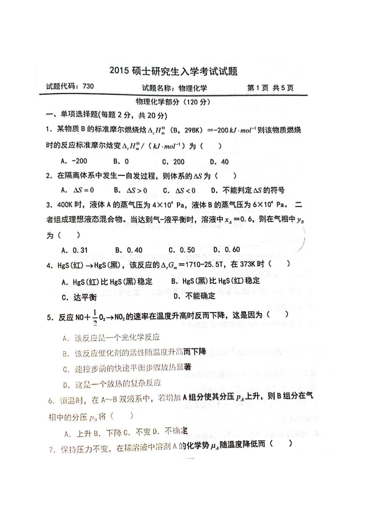 陕西师范大学730物理化学(含结构化学)2015年真题