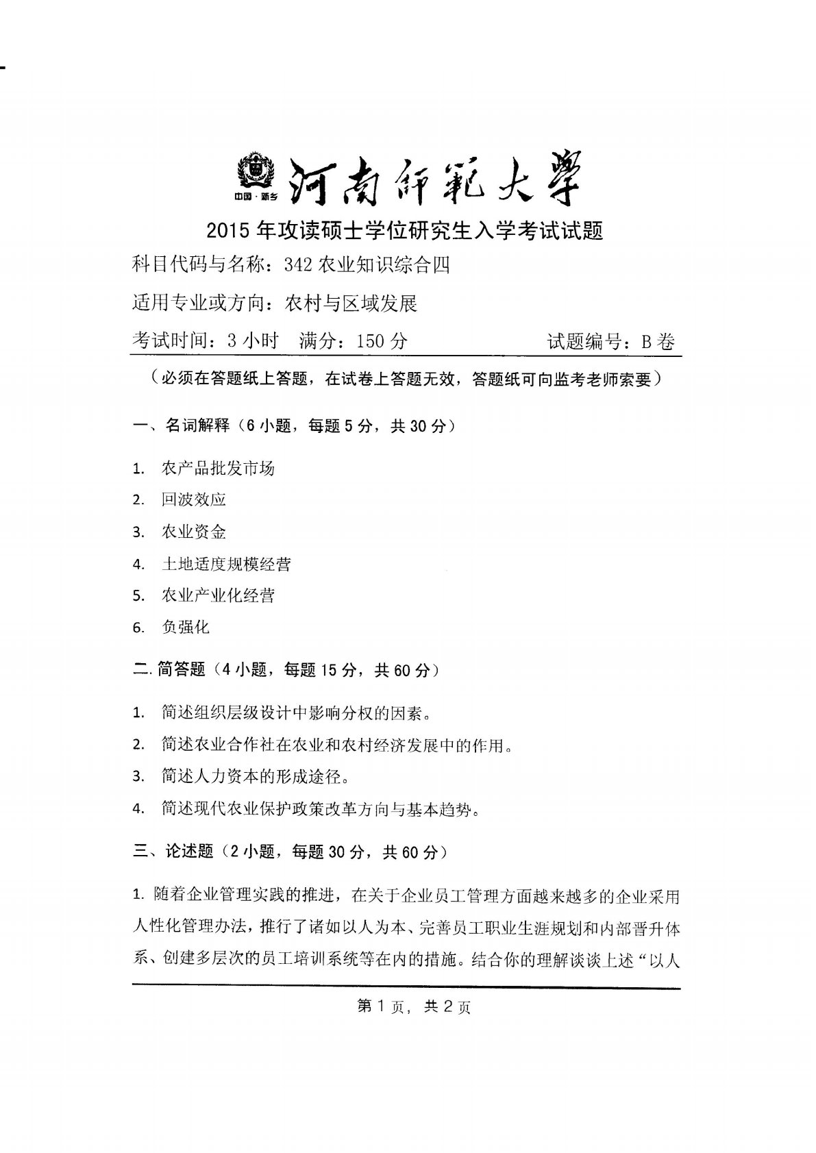 河南师范大学342农业知识综合四2015年真题
