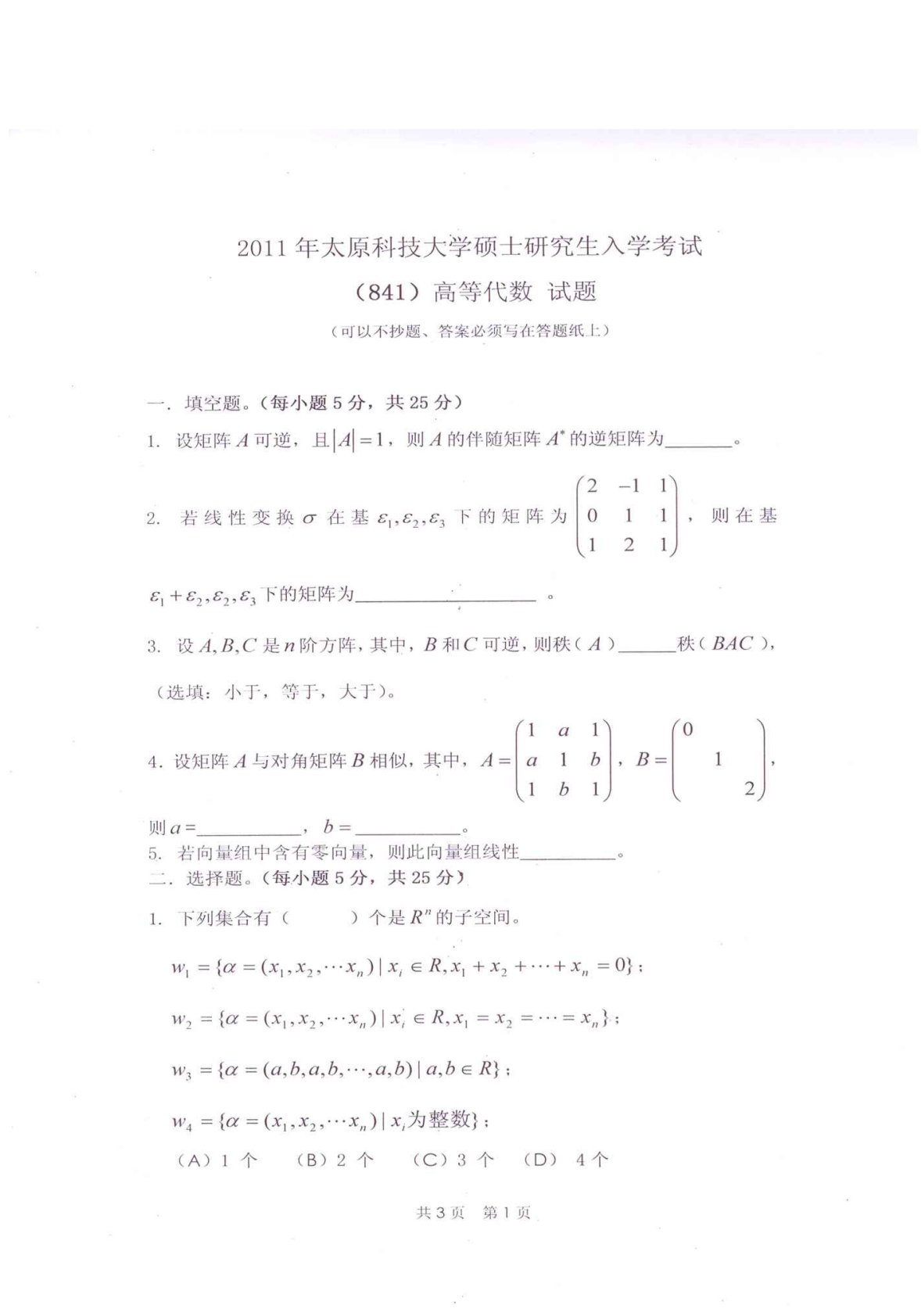 太原科技大学814高等代数2011年真题