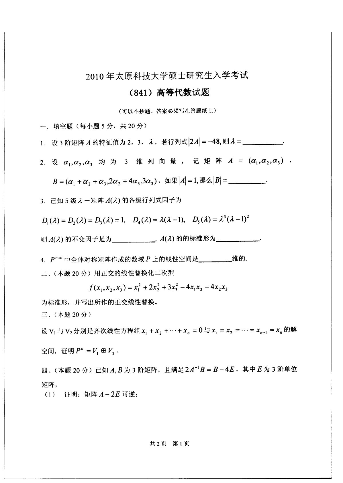 太原科技大学814高等代数2010年真题