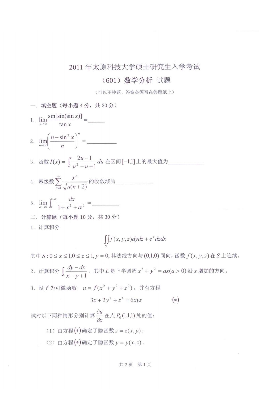 太原科技大学614数学分析2011年真题