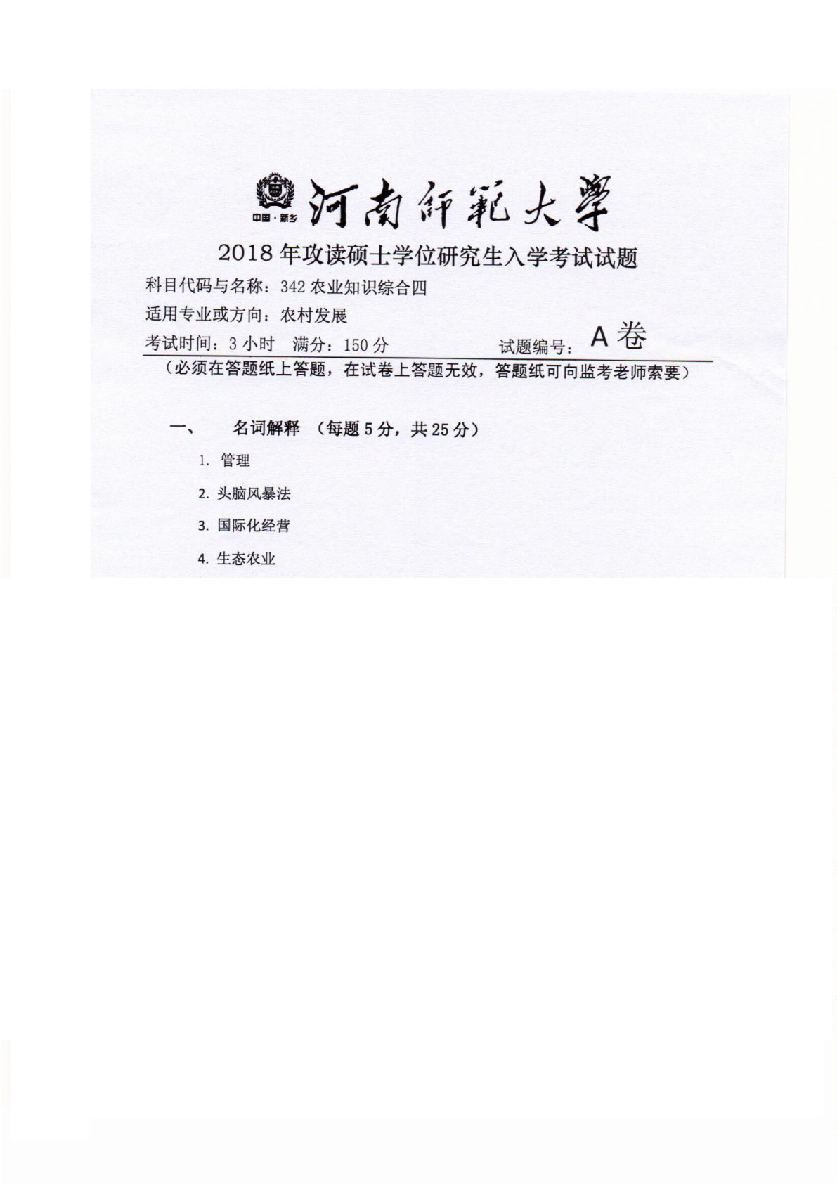河南师范大学342农业知识综合四2018年真题