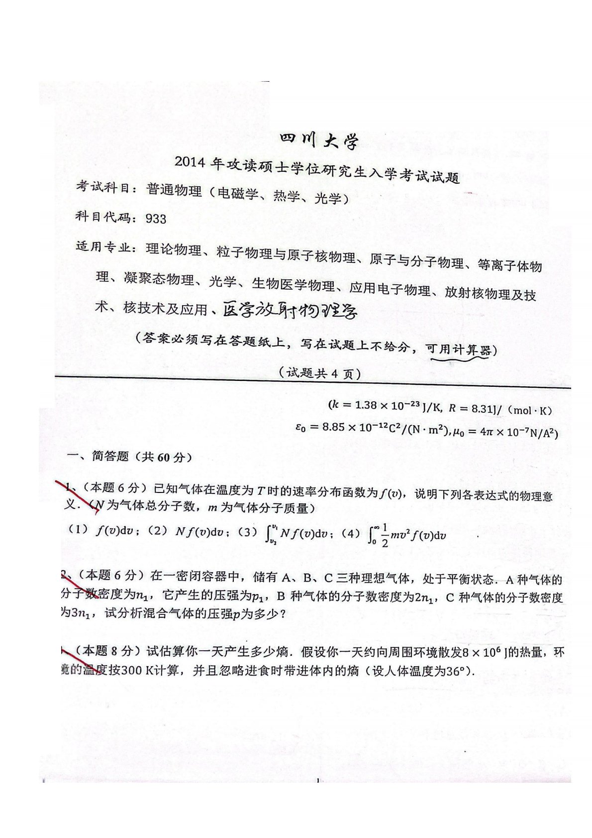 四川大学822普通物理(光学、电磁学)2014年真题