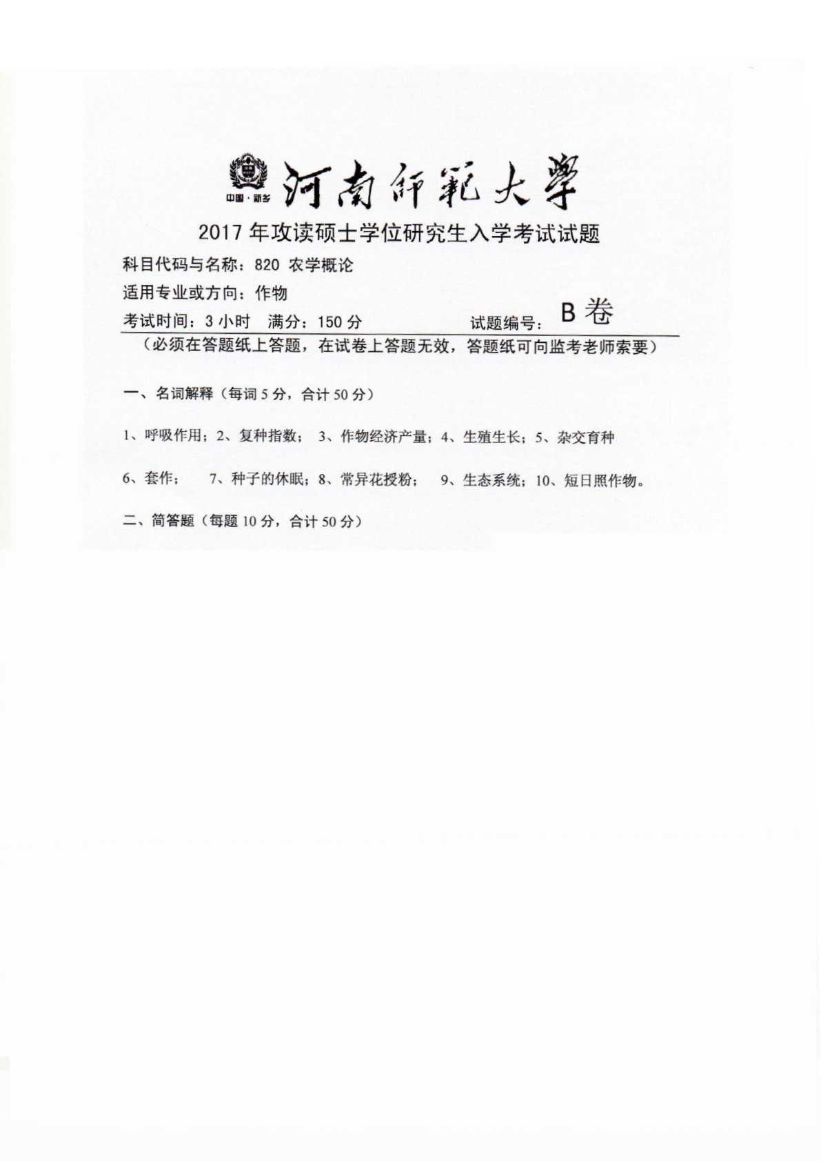 河南师范大学820农学概论2017年真题