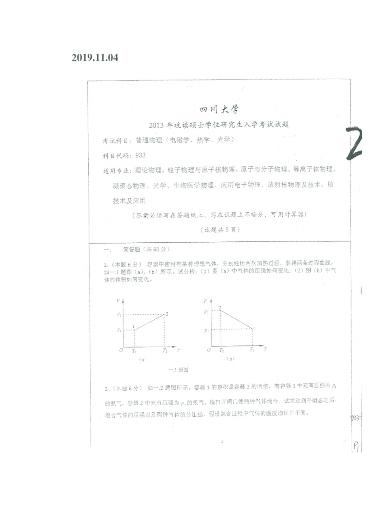 四川大学822普通物理(光学、电磁学)2013年真题1.