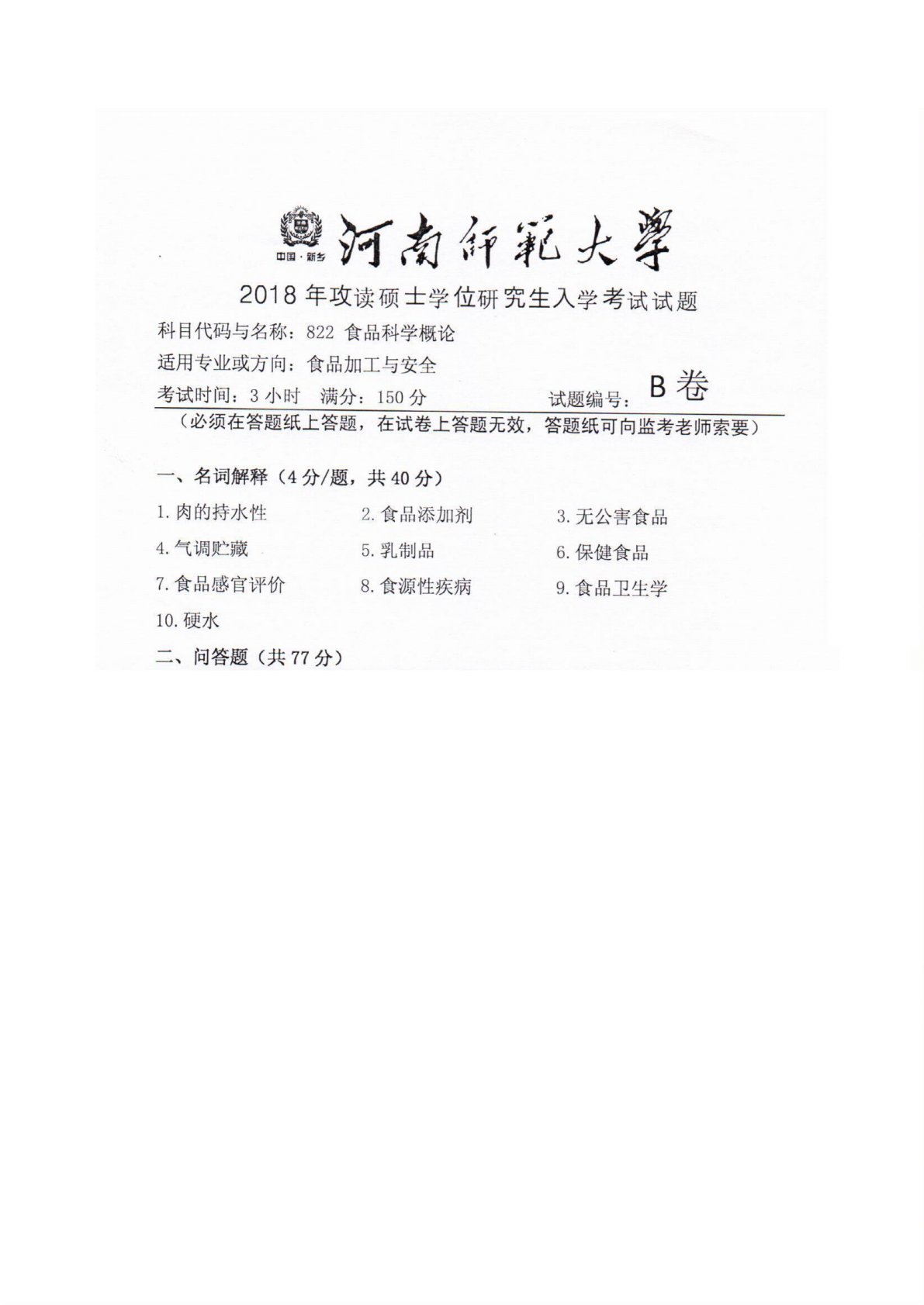 河南师范大学822食品科学概论2018年真题
