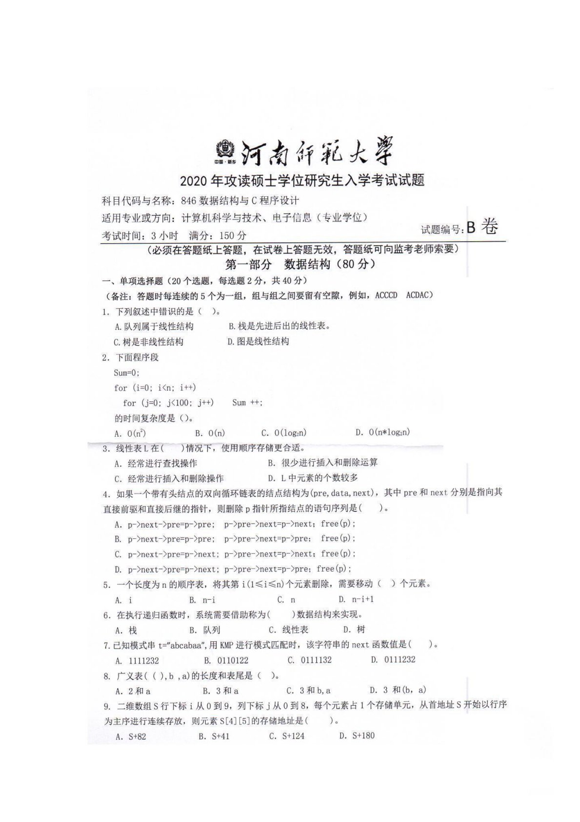 河南师范大学846数据结构与C程序设计2020年真题