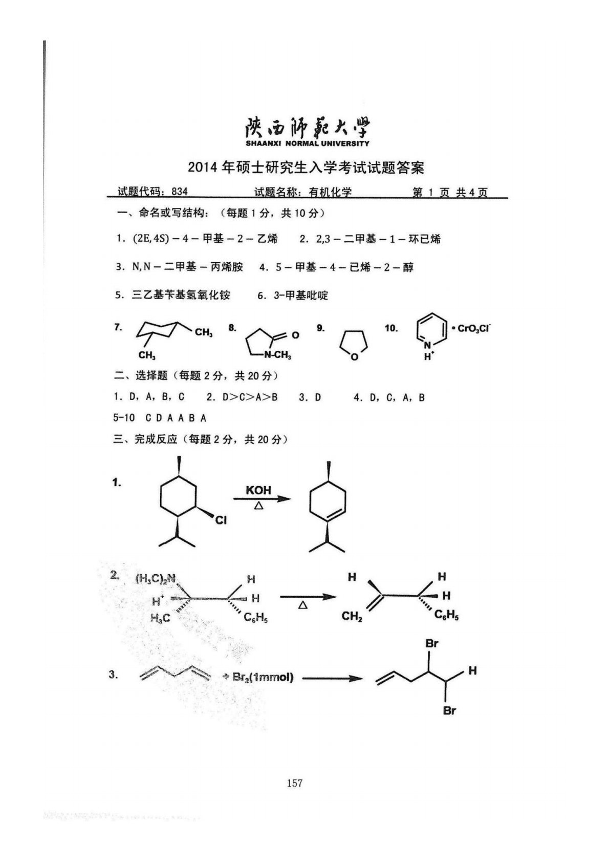 陕西师范大学832综合化学2014年真题答案(有机化学)