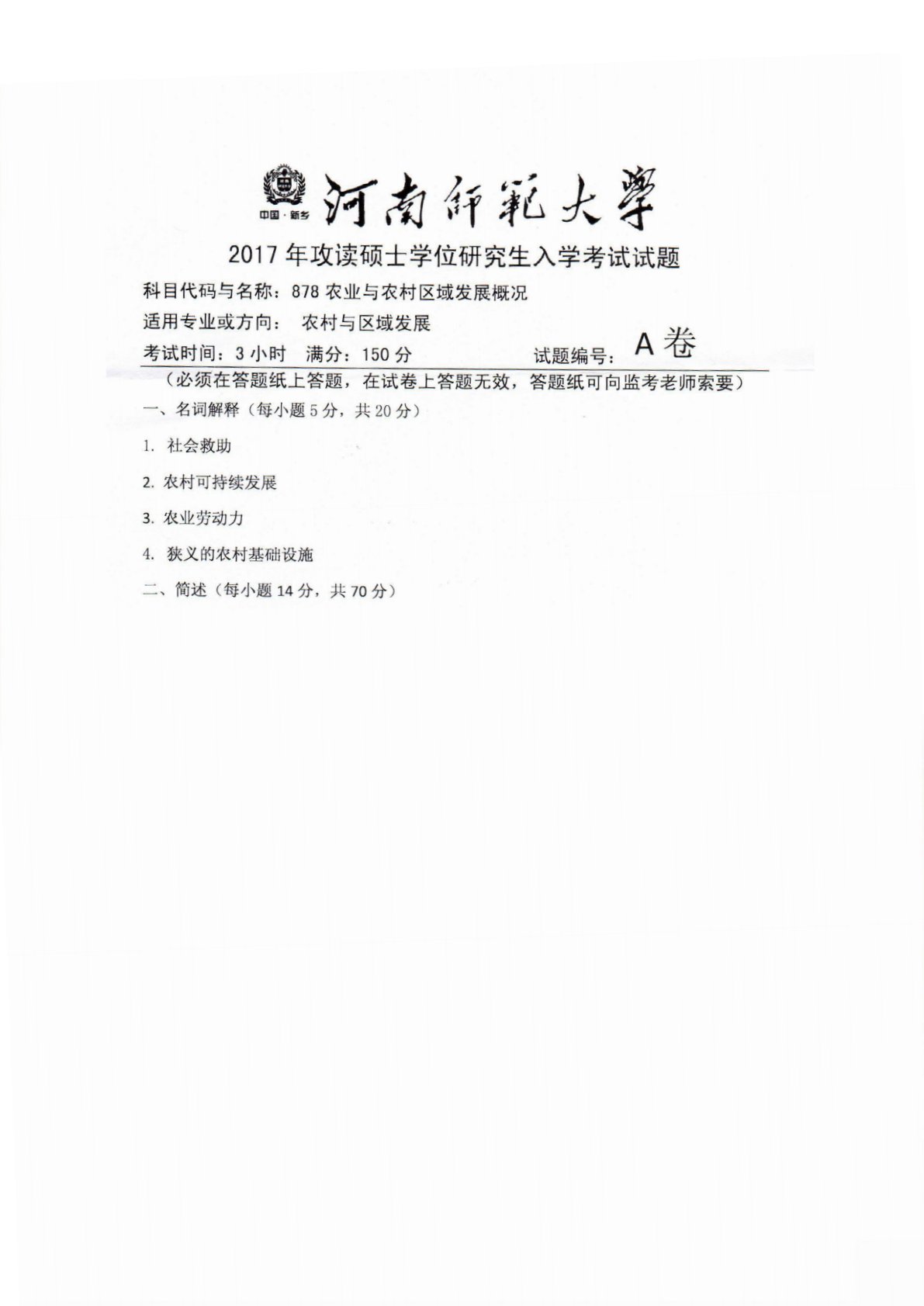 河南师范大学878农业与农村区域发展概况2017年真题