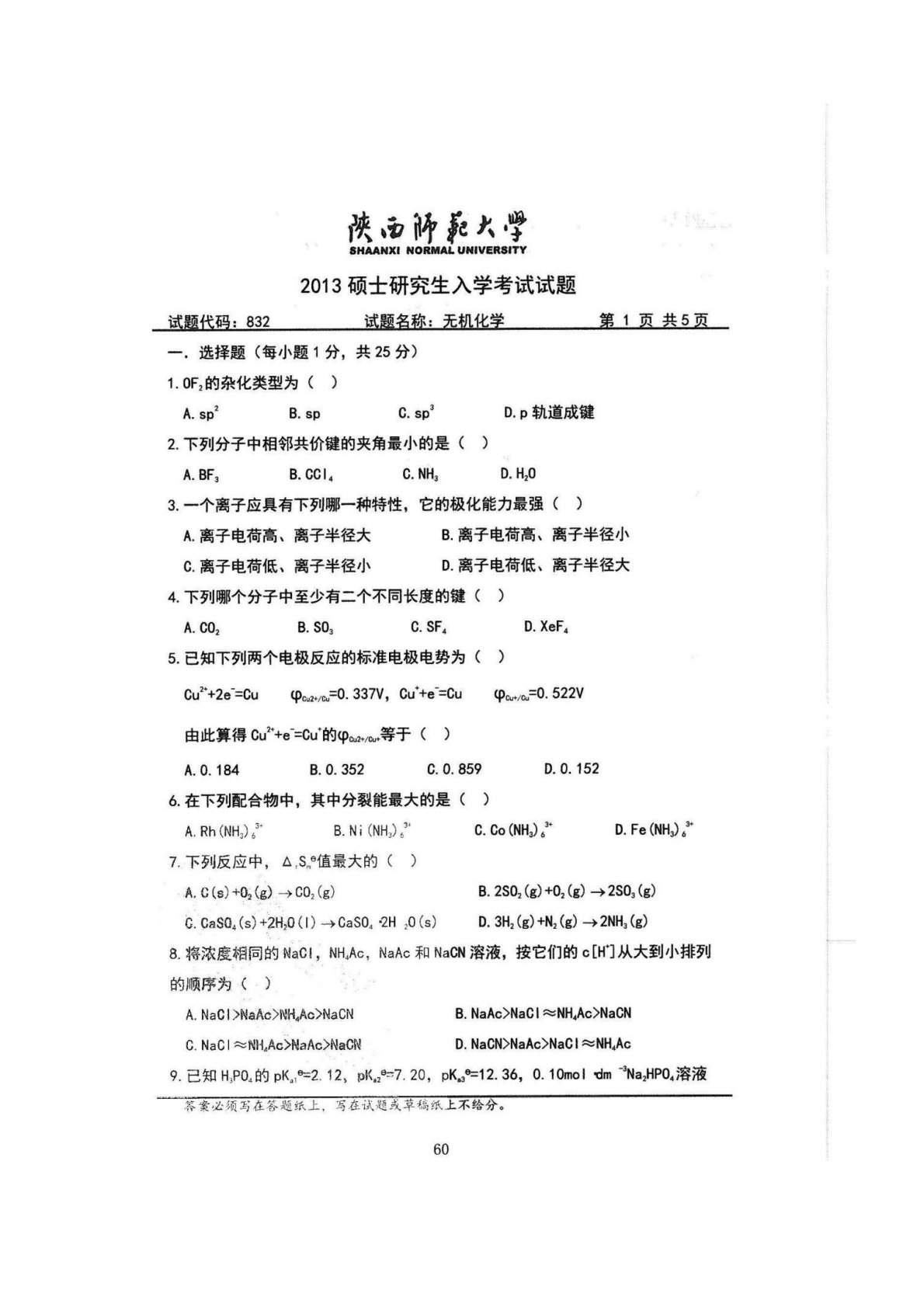 陕西师范大学832综合化学2013年真题(无机化学)