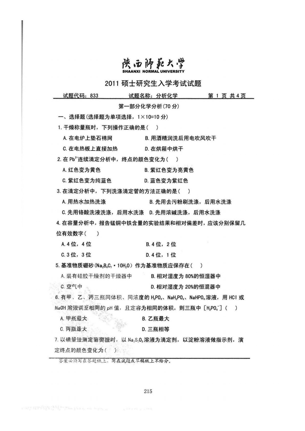 陕西师范大学832综合化学2011年真题(分析化学)