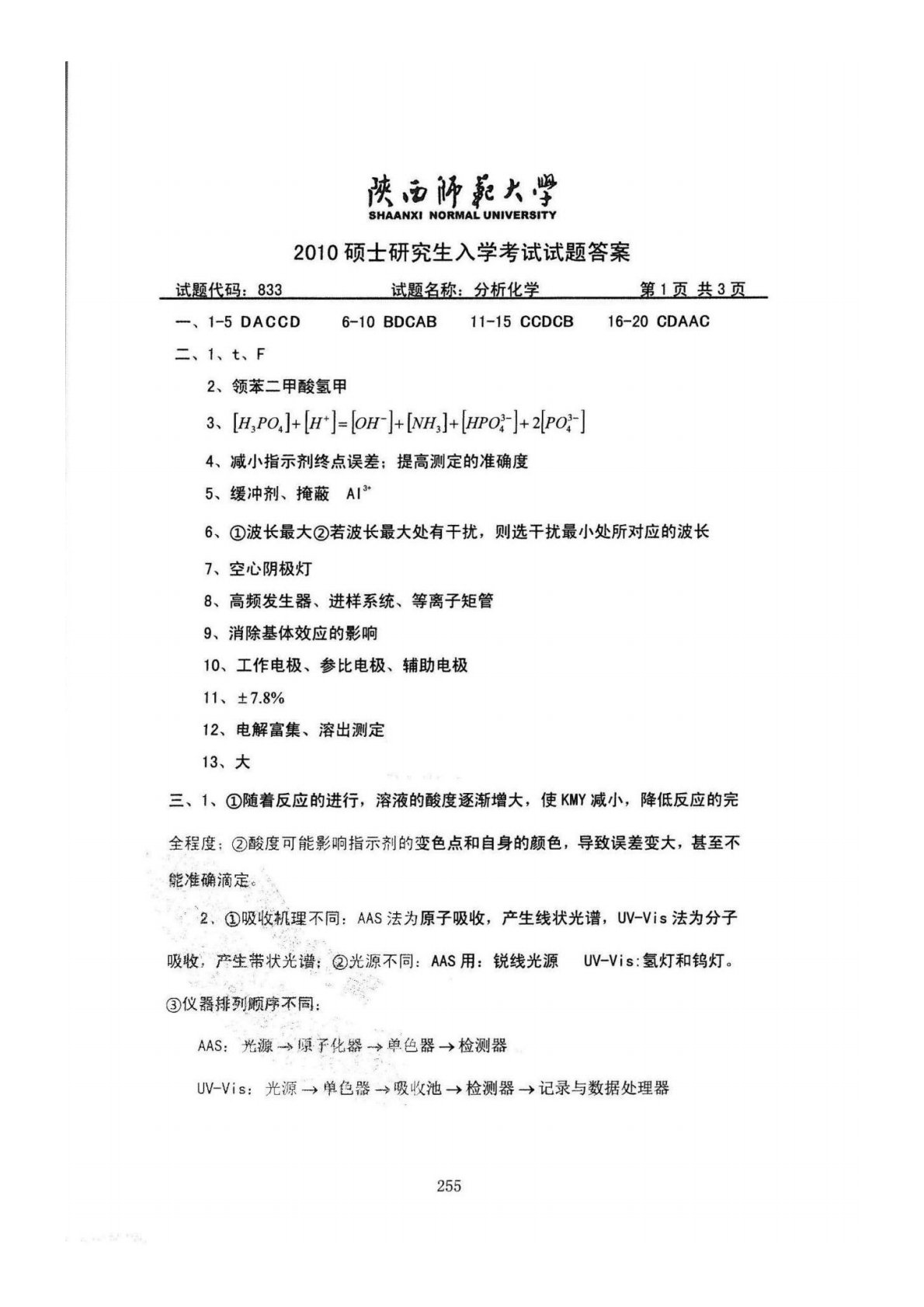 陕西师范大学832综合化学2010年真题答案(分析化学)