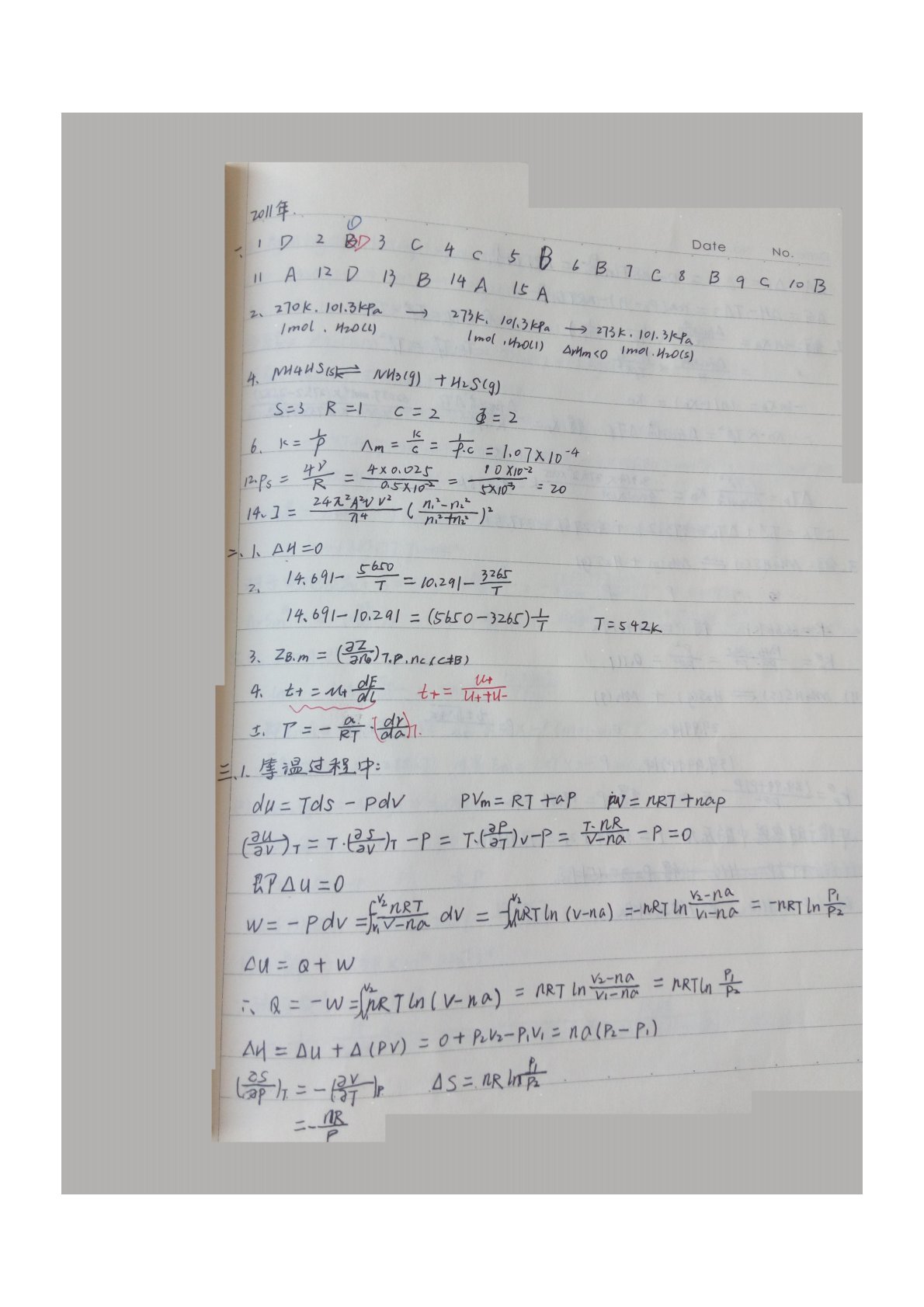 陕西师范大学730物理化学(含结构化学)2011年真题答案手写版