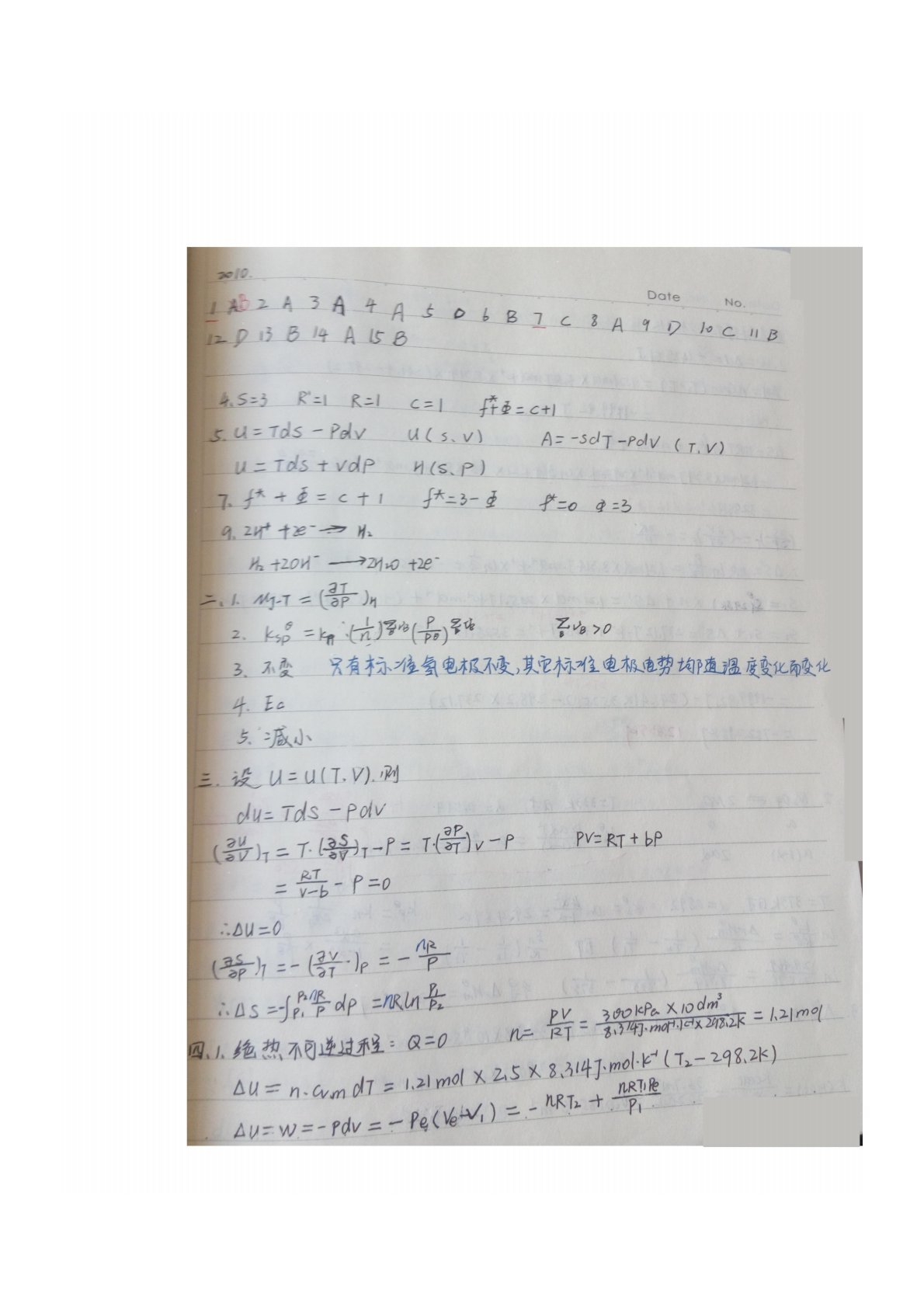 陕西师范大学730物理化学(含结构化学)2010年真题答案手写版