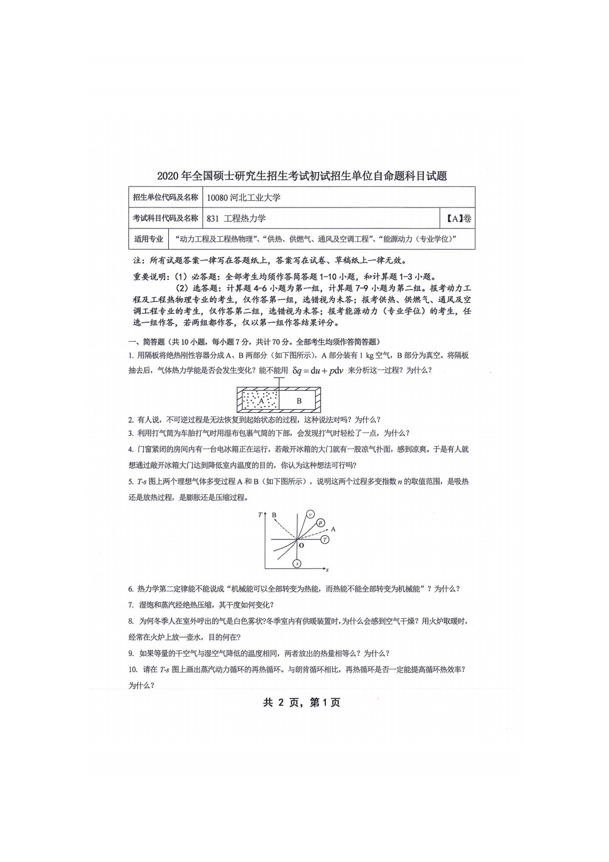 河北工业大学831工程热力学2020年真题及答案