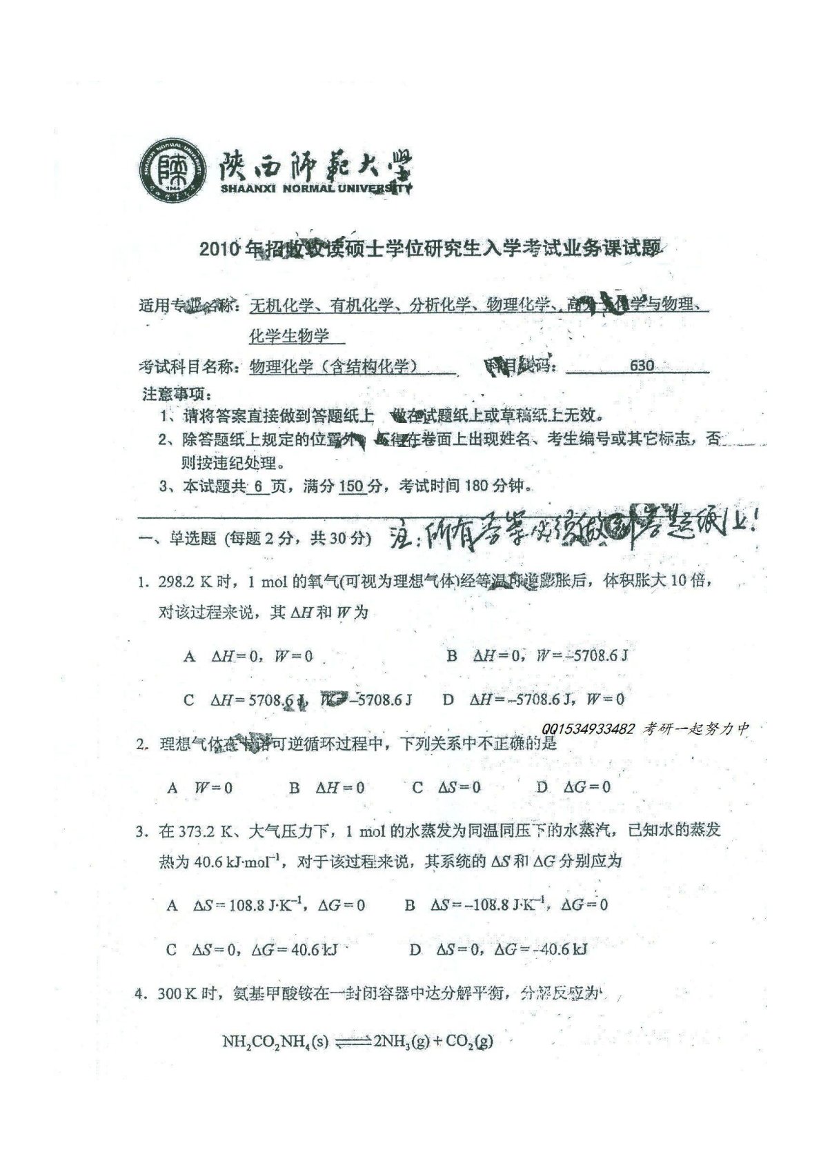 陕西师范大学730物理化学(含结构化学)2010年真题