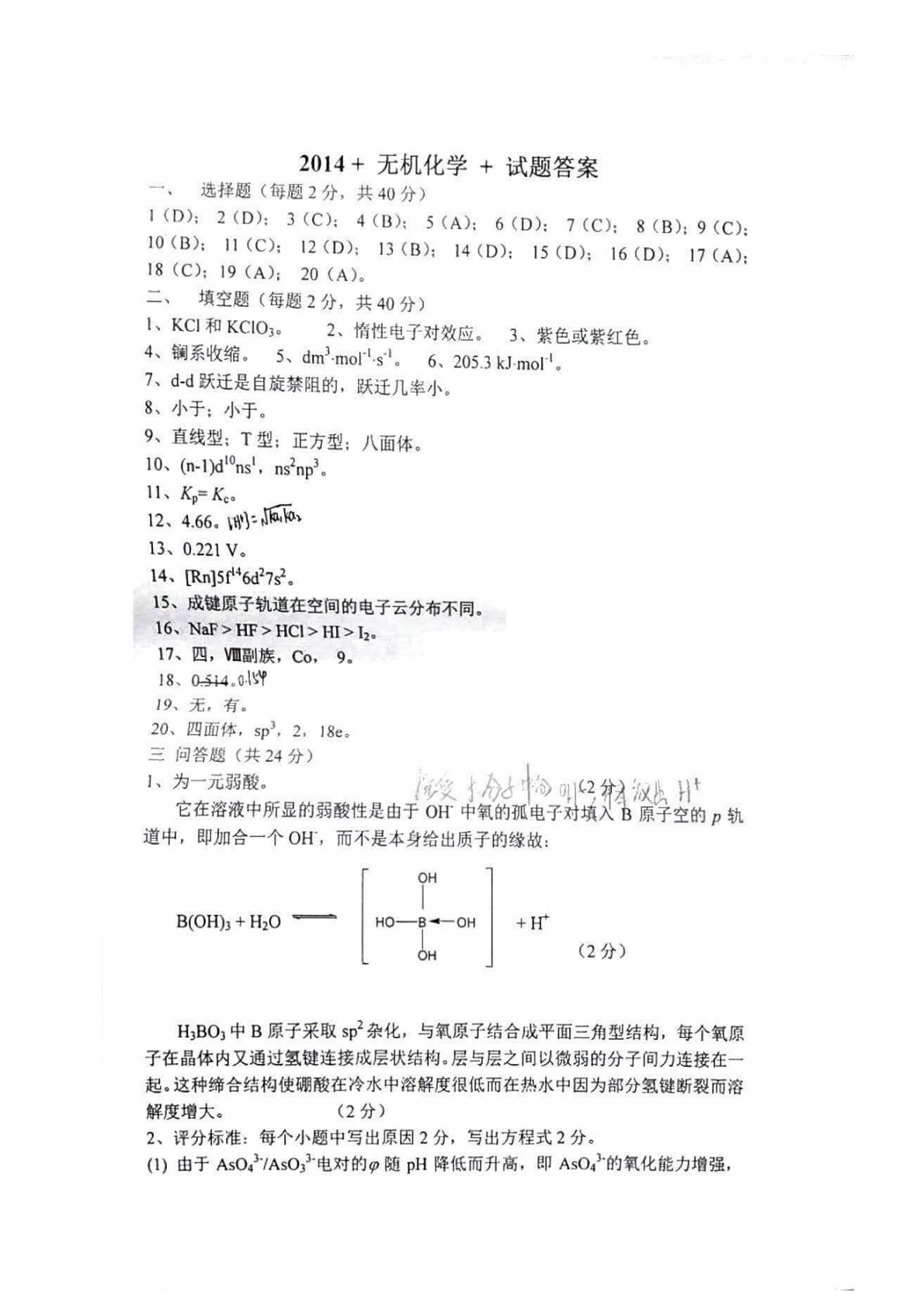 山西大学622综合化学一(无机化学、分析化学各 50%)2014年真题答案解析