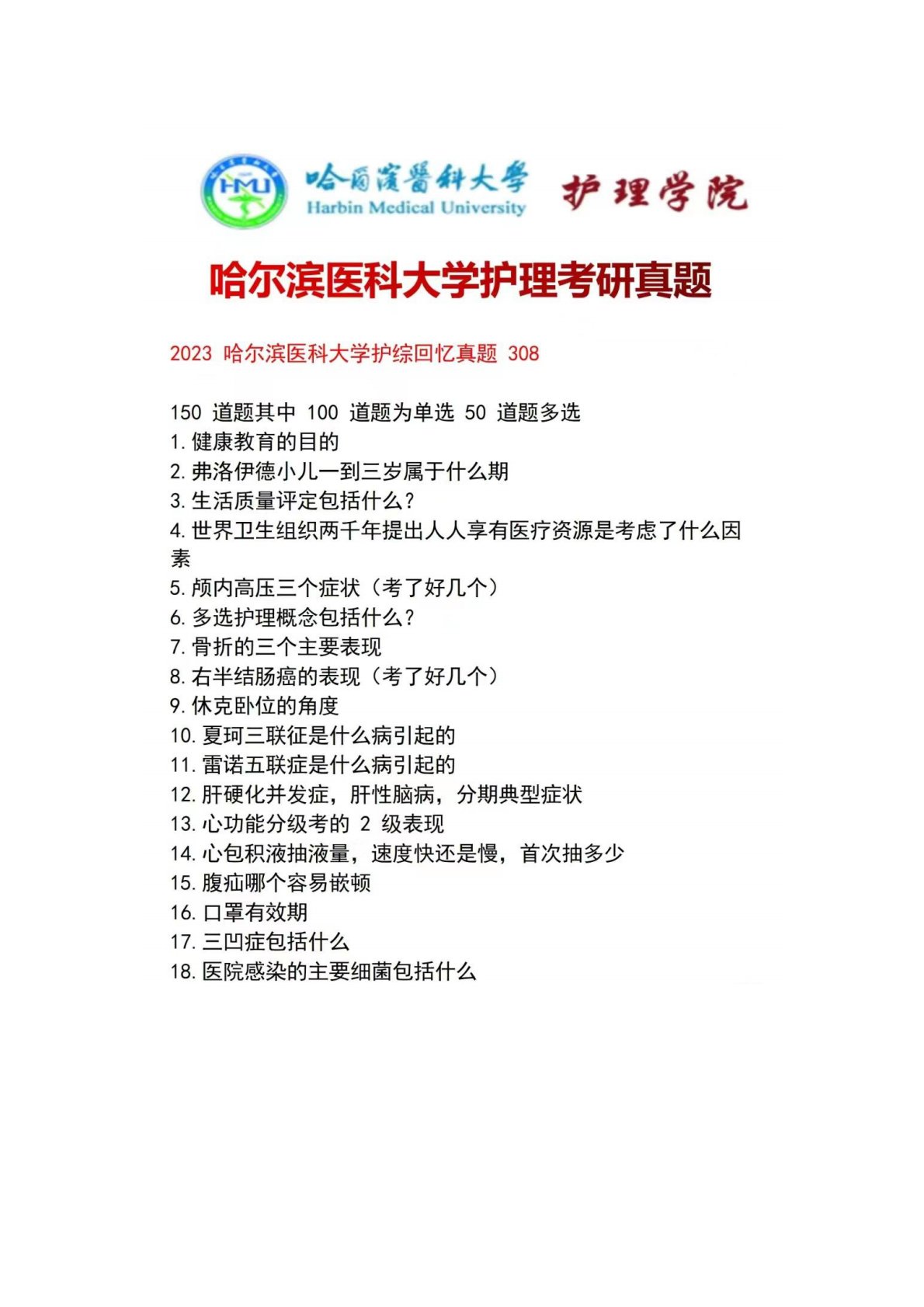 哈尔滨医科大学308护理综合2023年真题回忆版