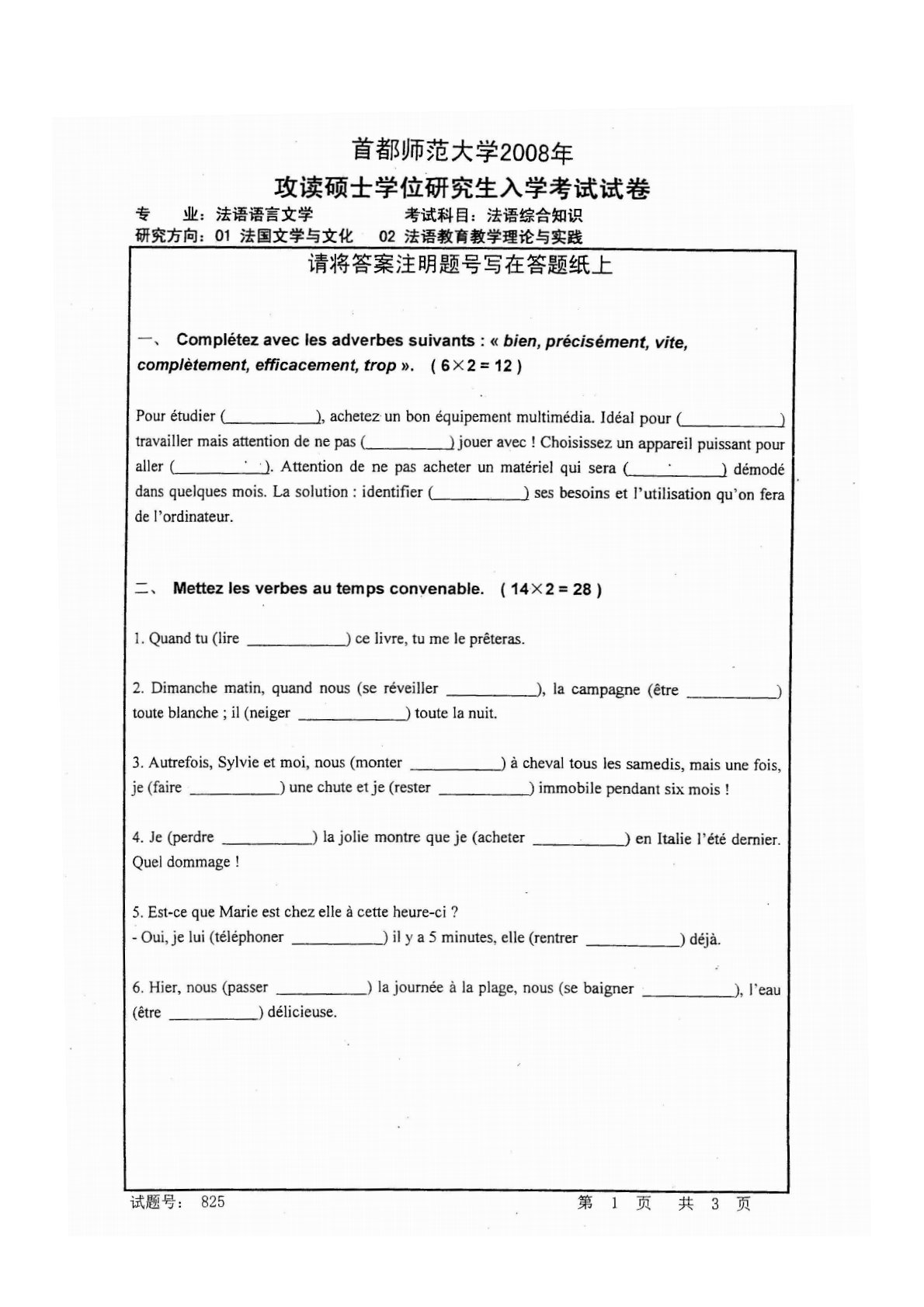 首都师范大学825法语综合知识2008年真题