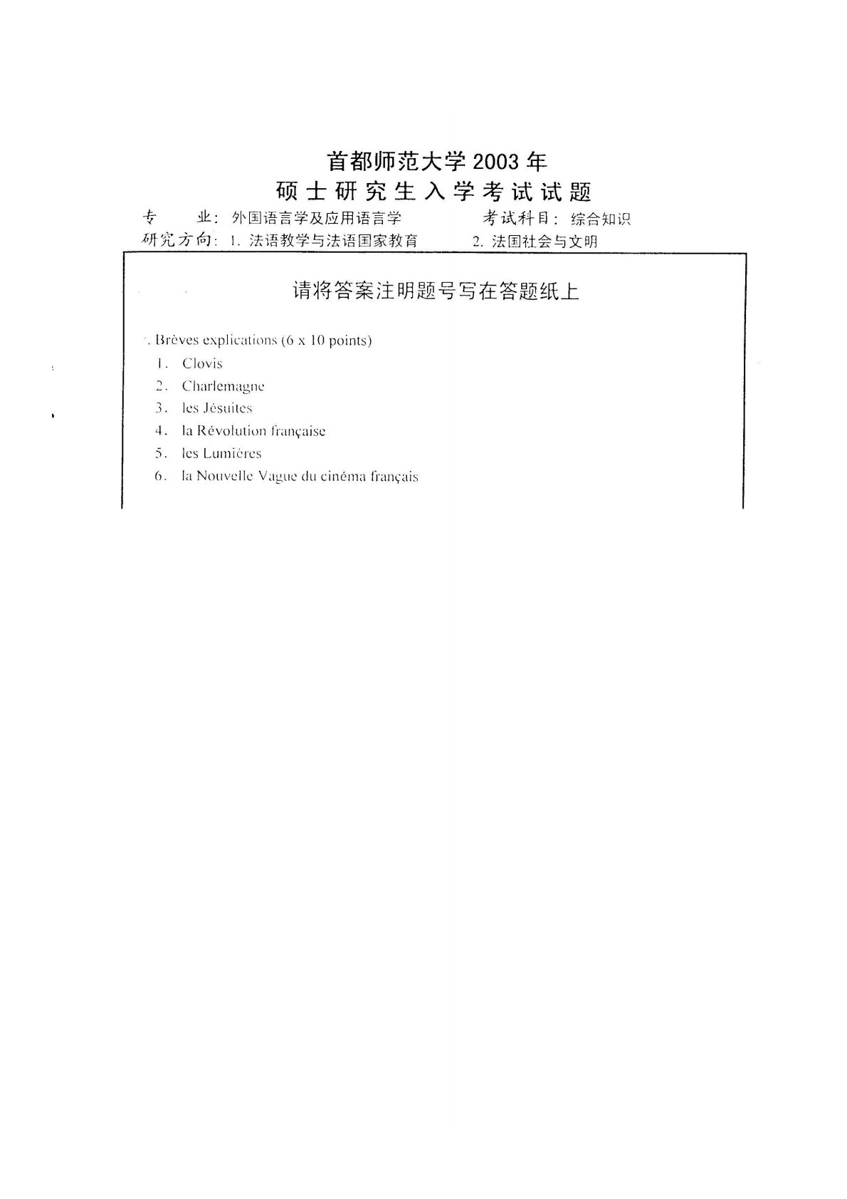 首都师范大学825法语综合知识2003年真题