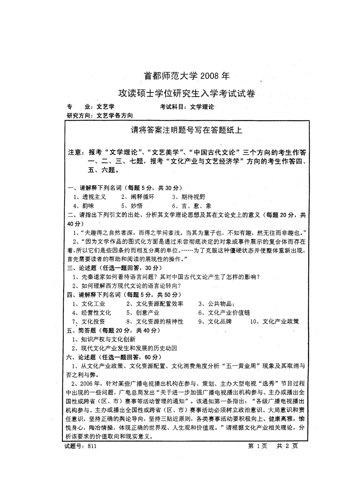 首都师范大学808文学理论与中外文学史2008年真题(文学理论)