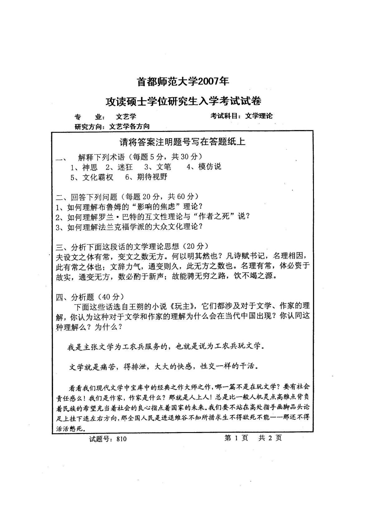 首都师范大学808文学理论与中外文学史2007年真题(文学理论)