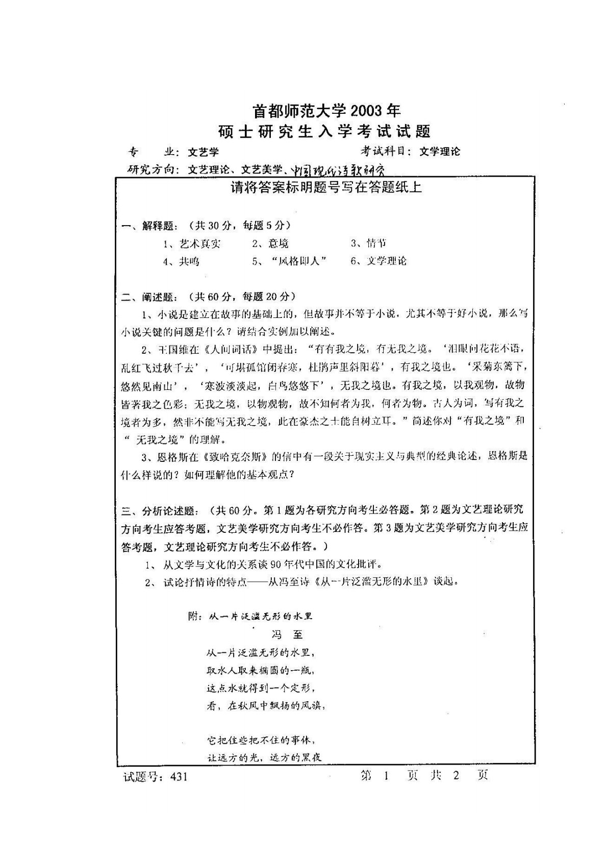 首都师范大学808文学理论与中外文学史2003年真题(文学理论)