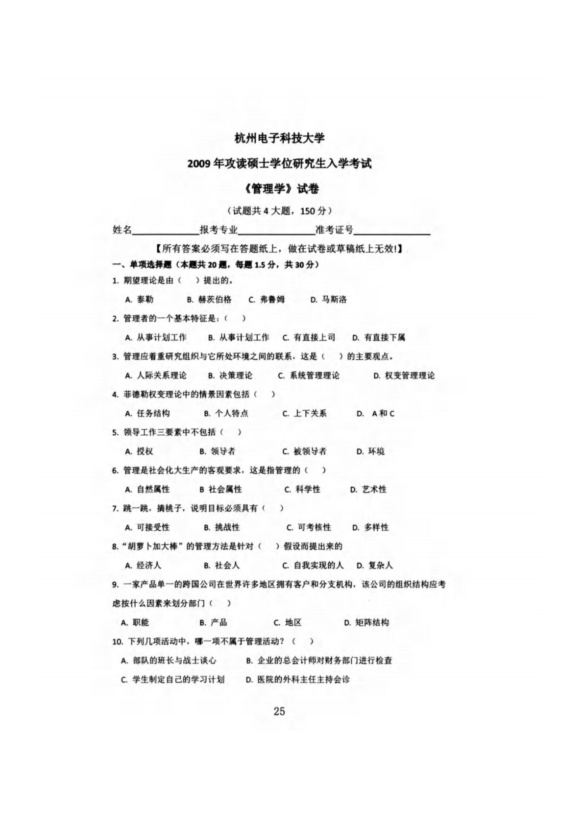 杭州电子科技大学831管理学2009年真题