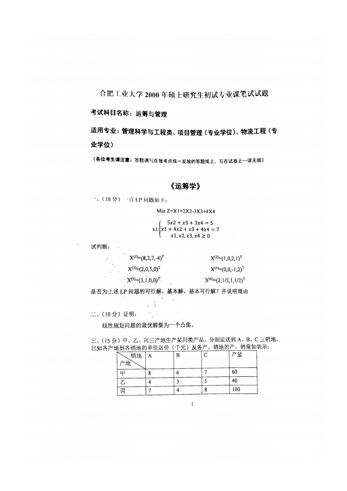 合肥工业大学846运筹与管理2000年真题