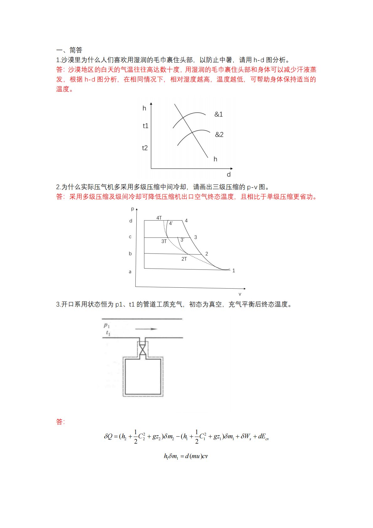 一、简答1.沙漠里为什么人们喜欢用湿润的毛巾裹住头部,以防止中暑,请用h-d图分析。答:沙漠地区的白天的气温往往高达数十度,用湿润的毛巾裹住头部和身体可以减少汗液蒸发,根据h-d图分析,在相同情况下,相对湿度越高,温度越低,可帮助身体保持适当的温度。2.为什么实际压气机多采用多级压缩中间冷却,请画出三级压缩的p-v图。答:采用多级压缩及级间冷却可降低压缩机出口空气终态温度,且相比于单级压缩更省功。3.开口系用状态恒为p1、t1的管道工质充气,初态为真空,充气平衡后终态温度。答:222222111111()()22scvQhCgzmhCgzmWdE11()hmdmucv...