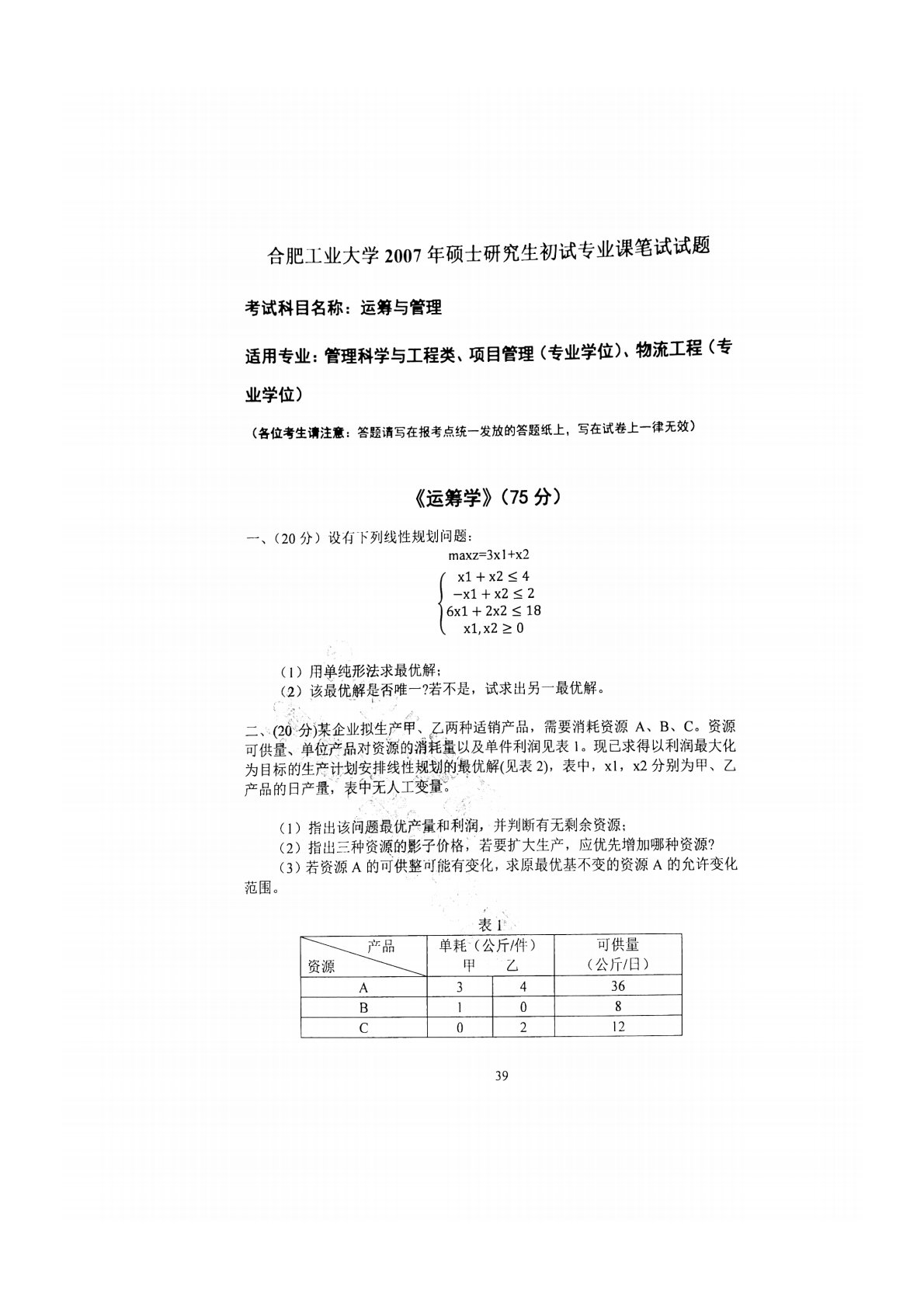 合肥工业大学846运筹与管理2007年真题