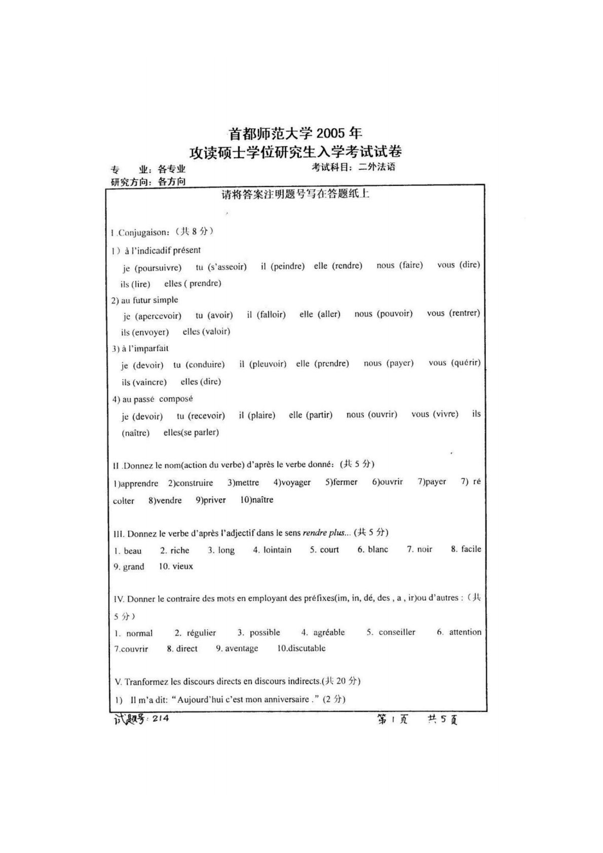 首都师范大学244二外法语2005年真题