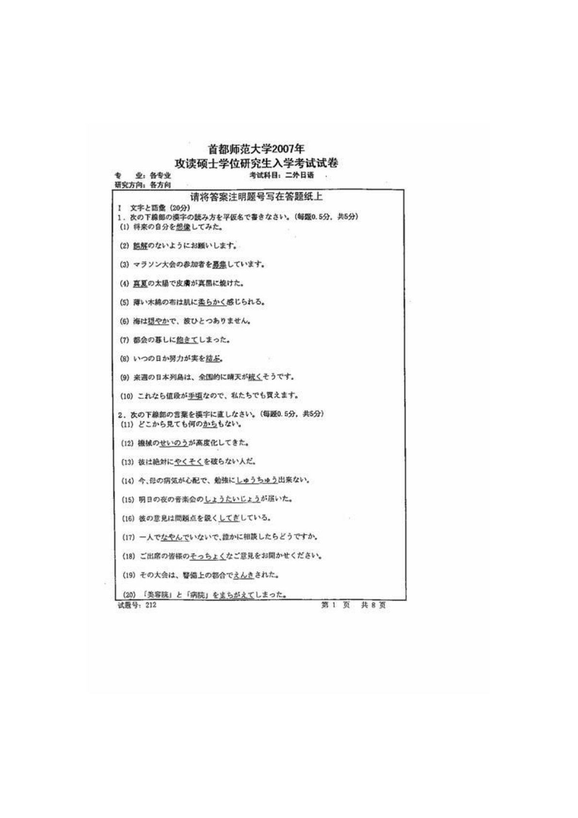 首都师范大学243二外日语2007年真题